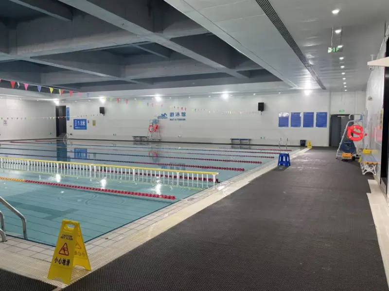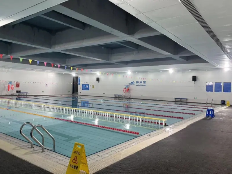 Vonkajšia časť bazéna je vybavená kovovým panelovým systémom rybích šupín, ktorý vytvára efekt svetla a tieňa podobný šupinám, ktorý sa mení so zakrivením fasády a smerom slnečného svetla, čím sa zvyšuje „prúd vody“. Celá strešná konštrukcia krytého bazéna je odkrytá, s priehradovým nosníkom s rozpätím 48 metrov, zdôrazňujúc explicitné vyjadrenie štrukturálnej logiky a posilňujúce priestorovú mierku a zmysel pre silu športoviska. V areáli sa nachádzajú dva bazény: súťažný bazén a tréningový bazén. Súťažný bazén je 50 metrov dlhý a 25 metrov široký, s 8 dráhami; tréningový bazén je 50 metrov dlhý a 17 metrov široký so 6 dráhami. Oba bazény sú hlboké 2 metre.